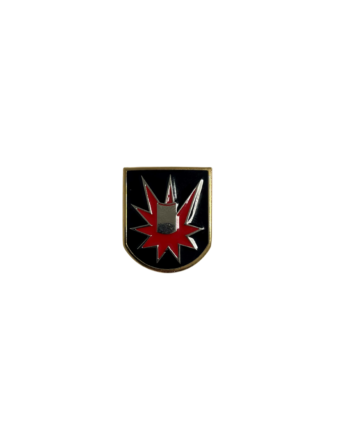 DESCRIPCIÓN. Escudo español, con filete de oro de 1 mm de ancho, en campo de sable. En abismo estrella irregular de diez rayos de gules, fileteada en plata, resaltado escudo de protección en plata. JUSTIFICACIÓN. El rojo simboliza el fuego, el fileteado de plata la metralla y el campo negro el terreno calcinado. El escudo de protección representa al EOD, que con su labor anula o disminuye el daño. El filete en oro representa al oficial EOD