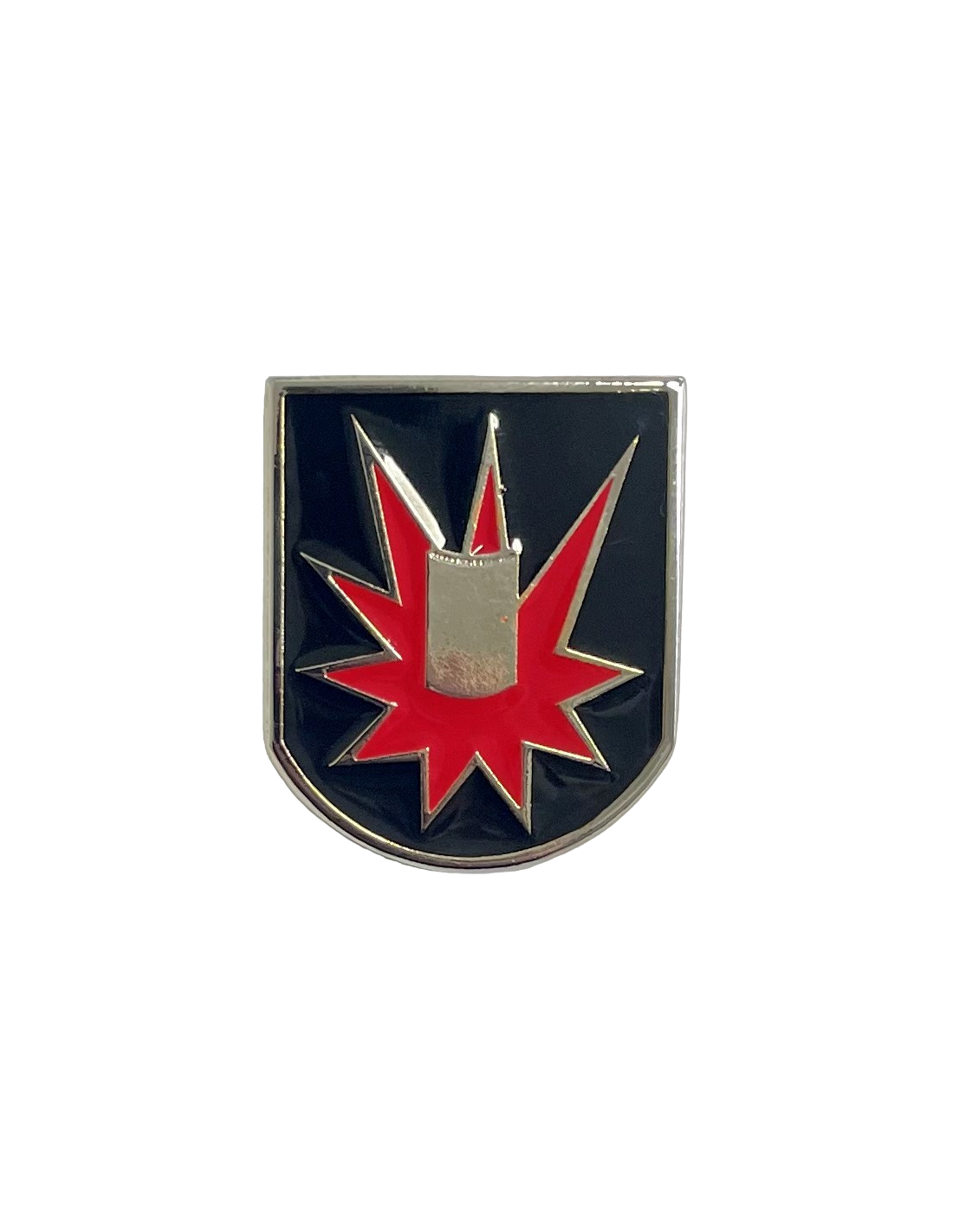 DESCRIPCIÓN. Escudo español, con filete de plata de 1 mm de ancho, en campo de sable. En abismo estrella irregular de diez rayos de gules, fileteada en plata, resaltado escudo de protección en plata. JUSTIFICACIÓN. El filete en plata representa al suboficial EOD