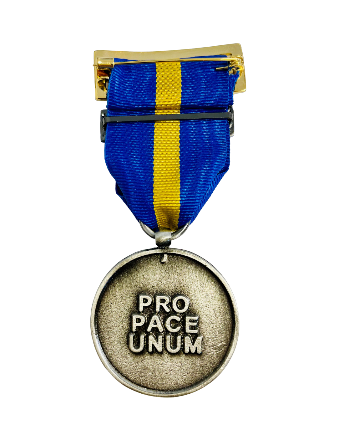 - Medalla circular con cinta y pasador incluidos.