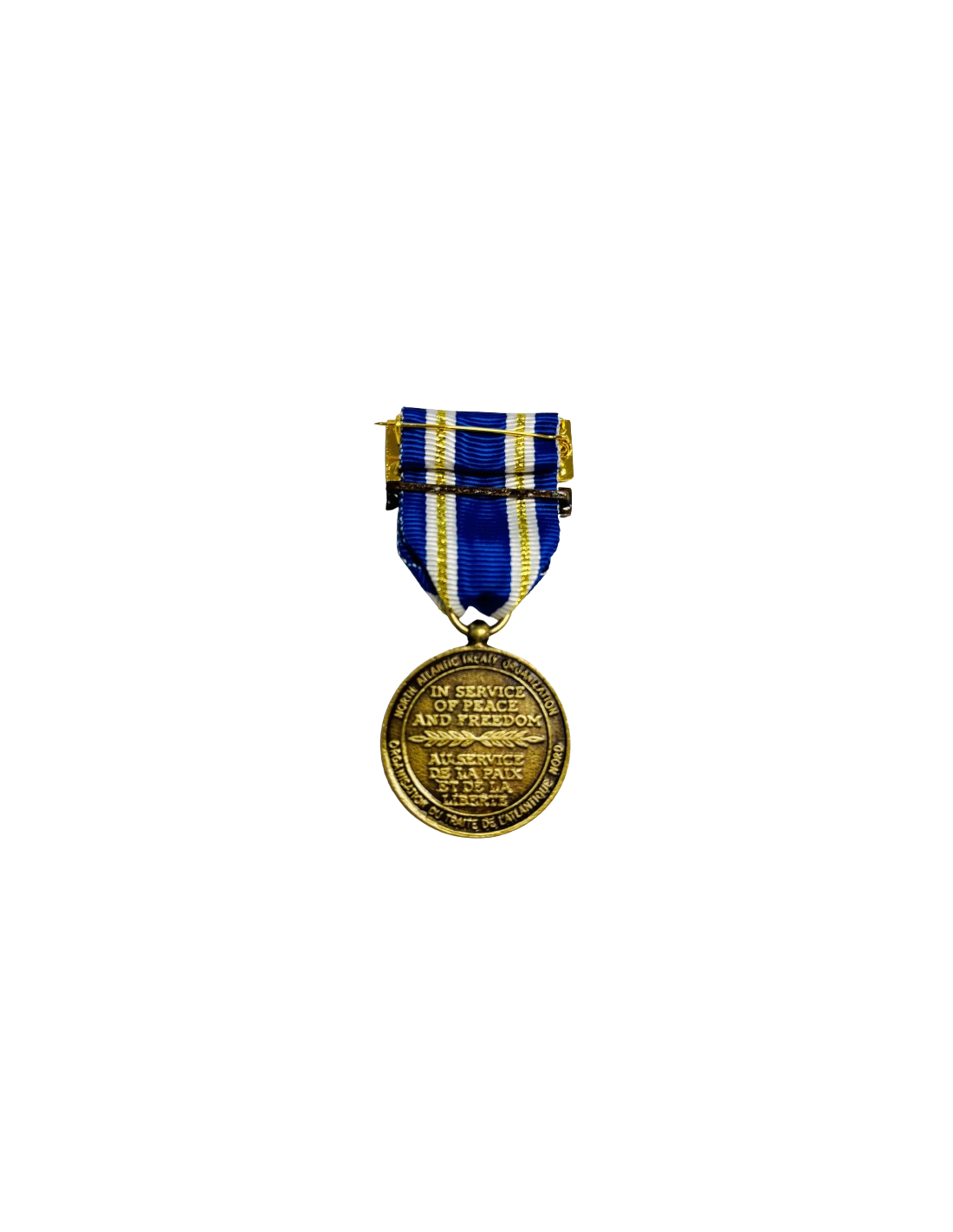 Es circular, de color oro viejo para las article 5 y non article 5 y de color plata para la meritorius. En el anverso presenta la estrella de la OTAN, entre una corona de ramas de olivo. En el reverso lleva el nombre de la organización en inglés y francés NORTH ATLANTIC TREATY ORGANIZATION en la parte superior y ORGANISATION DU TRAITÉ DE L'ATLANTIQUE NORD en la inferior. En el centro lleva las inscripciones en inglés y francés IN SERVICE OF PEACE AND FREEDOM y AU SERVICE DE LA PAIX ET DE LA LIBERTÉ, separadas por una rama de hojas de laurel.